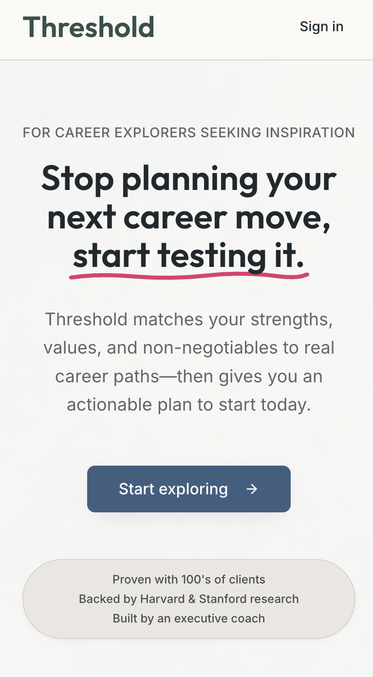 Looking for clarity, ASAP? Use Threshold, the AI-enabled tool coded with Julia’s expertise, to chart out three hyper-personalized career paths for you to explore.